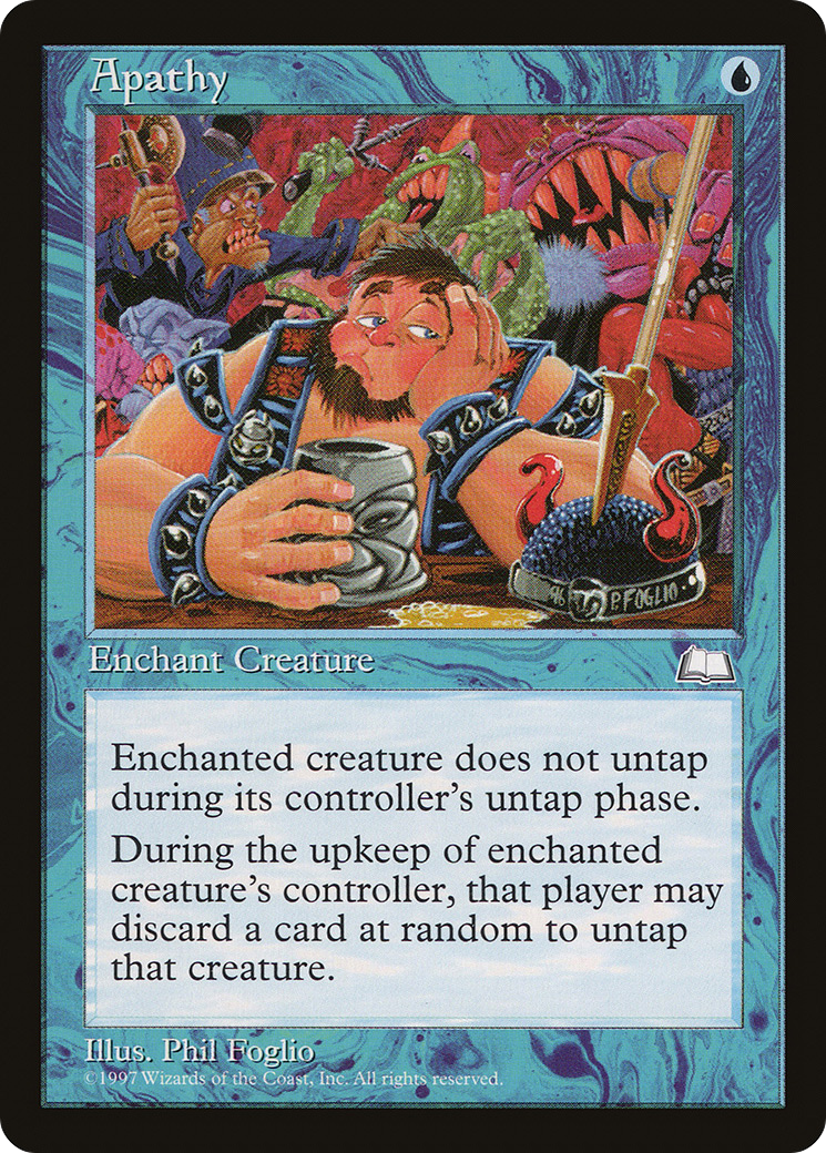 At the beginning of the upkeep of enchanted creature's controller, that player may discard a card at random. If the player does, untap that creature.