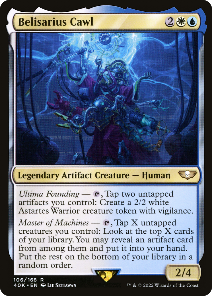 Ultima Founding — , Tap two untapped artifacts you control: Create a 2/2 white Astartes Warrior creature token with vigilance. Master of Machines — , Tap X untapped creatures you control: Look at the top X cards of your library. You may reveal an artifact card from among them and put it into your hand. Put the rest on the bottom of your library in a random order.