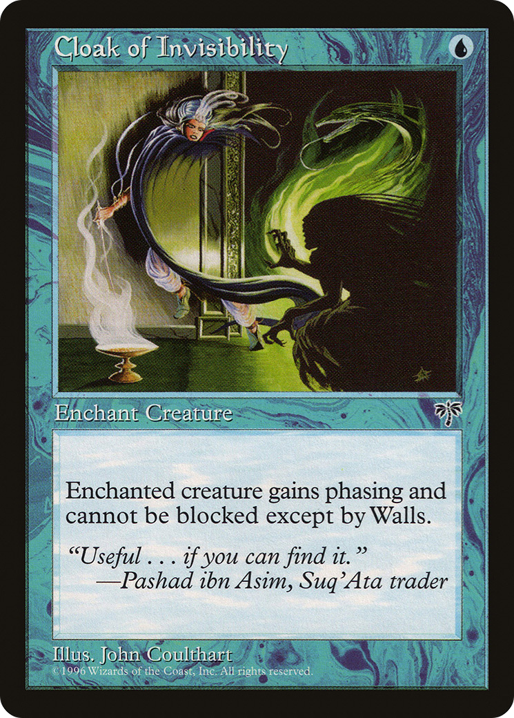 Enchanted creature has phasing and can't be blocked except by Walls. (It phases in or out before its controller untaps during each of their untap steps. While it's phased out, it's treated as though it doesn't exist.)
