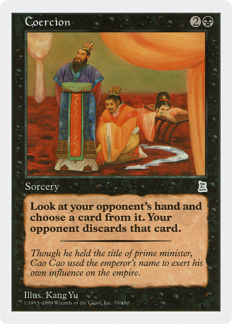 Target opponent reveals their hand. You choose a card from it. That player discards that card.