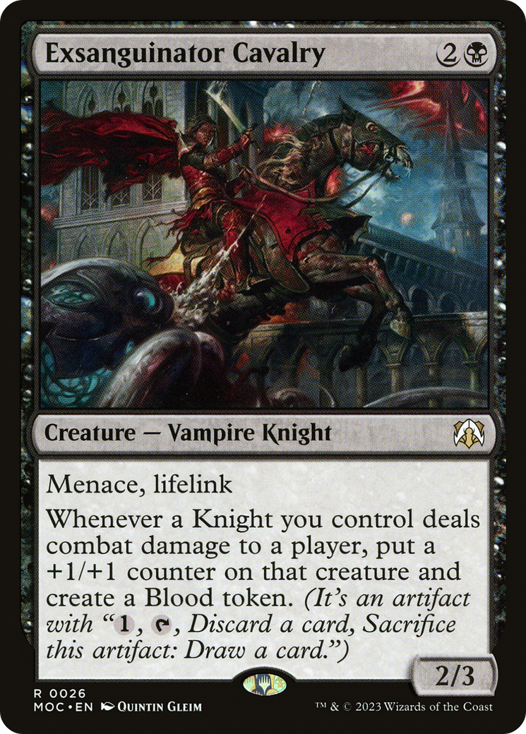 Menace, lifelink Whenever a Knight you control deals combat damage to a player, put a +1/+1 counter on that creature and create a Blood token. (It's an artifact with ", , Discard a card, Sacrifice this token: Draw a card.")