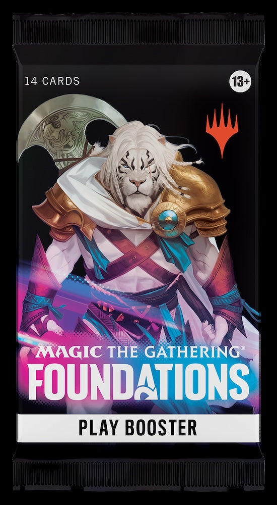 The best time to play your first Magic game is now. Dive intoFoundationsto create and share your quintessentialMagic: The Gatheringexperience playing with and collecting cards selected to give every player the advantage. ThisFoundationsPlay Booster contains 14Magic: The Gatheringcards and 1 Token/Ad card or Art card. (A regular Art card can be found in 30% of packs and a foil-stamped Signature Art card can be found in 5% of packs.) Each pack includes a combination of 1–4 cards of rarity Rare or higher and 3–5 Uncommon, 6–9 Common, and 1 Land cards (Full-Art Land in 25% of packs). One card of any rarity is Traditional Foil. The Land card is also Traditional Foil in 20% of boosters.