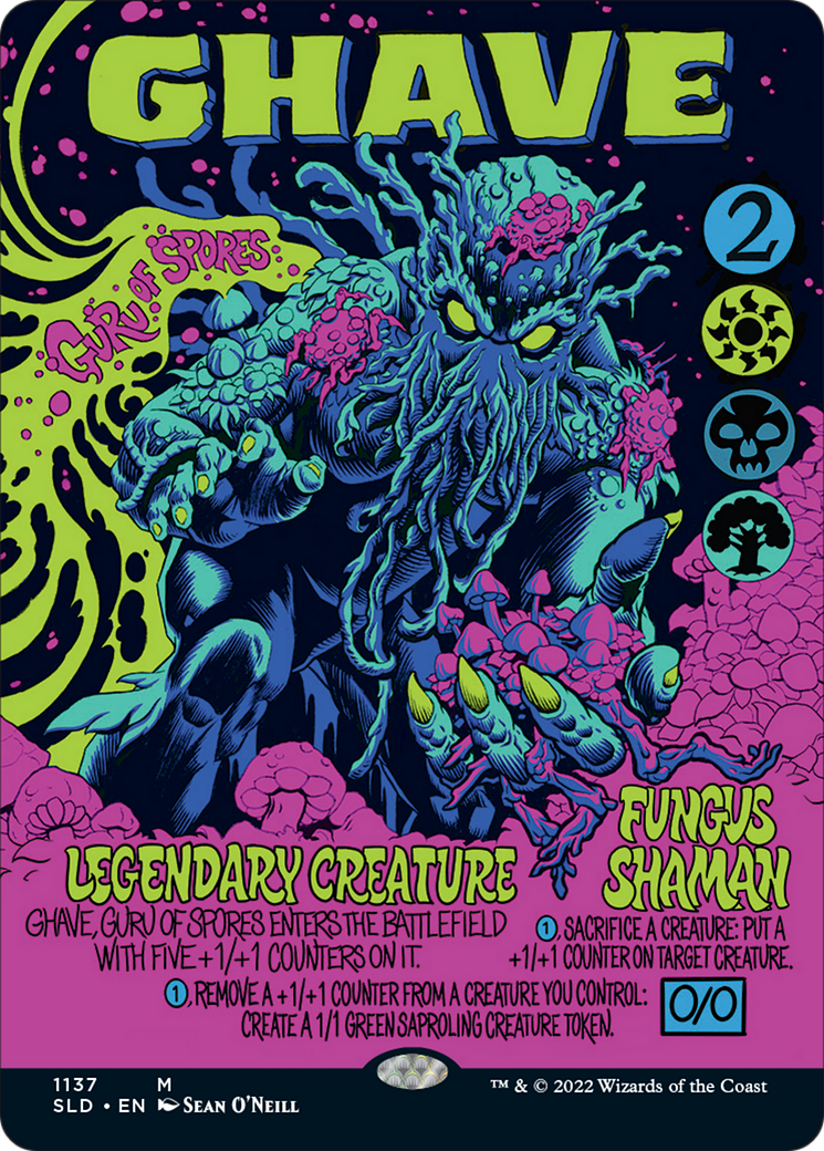 Ghave enters with five +1/+1 counters on it. , Remove a +1/+1 counter from a creature you control: Create a 1/1 green Saproling creature token. , Sacrifice a creature: Put a +1/+1 counter on target creature.