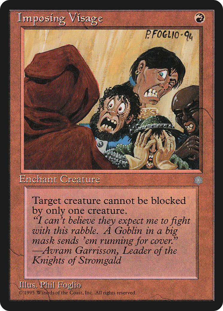 Enchanted creature has menace. (It can't be blocked except by two or more creatures.)