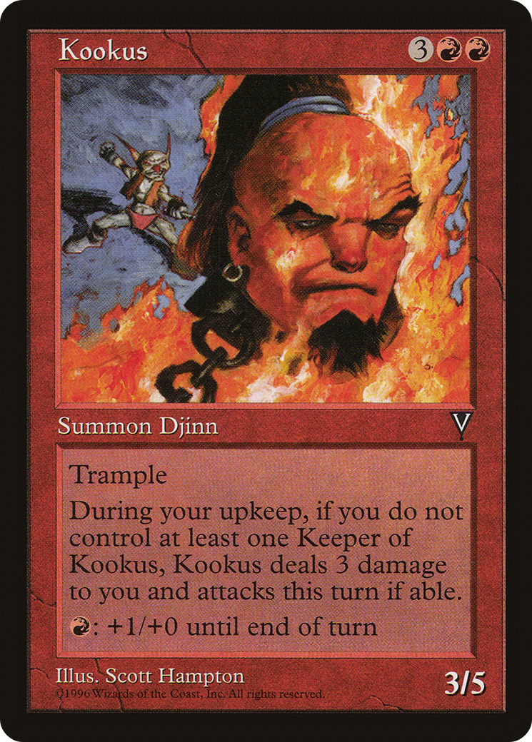 At the beginning of your upkeep, if you don't control a creature named Keeper of Kookus, this creature deals 3 damage to you and attacks this turn if able.