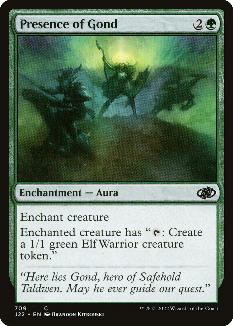 Enchanted creature has ": Create a 1/1 green Elf Warrior creature token."
