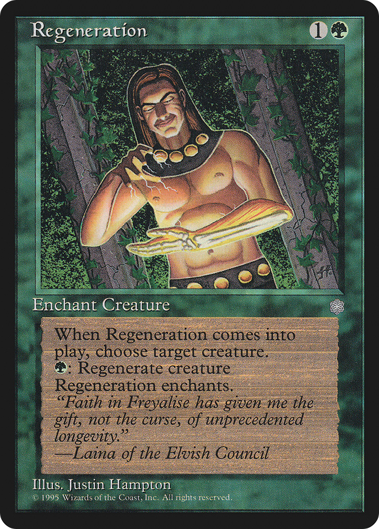 : Regenerate enchanted creature. (The next time that creature would be destroyed this turn, instead tap it, remove it from combat, and heal all damage on it.)