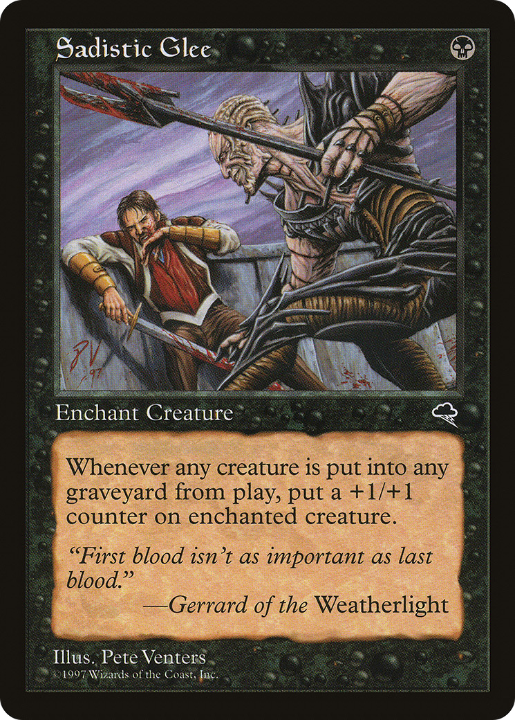 Whenever a creature dies, put a +1/+1 counter on enchanted creature.