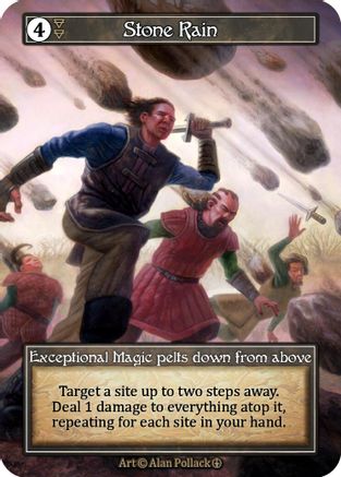 Target a site up to two steps away. Deal 1 damage to everything atop it, repeating for each site in your hand.