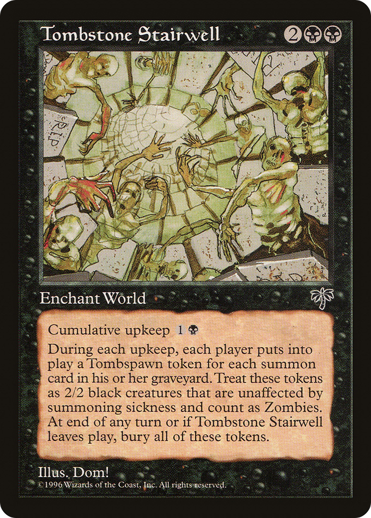 At the beginning of each upkeep, if this enchantment is on the battlefield, each player creates a 2/2 black Zombie creature token with haste named Tombspawn for each creature card in their graveyard.